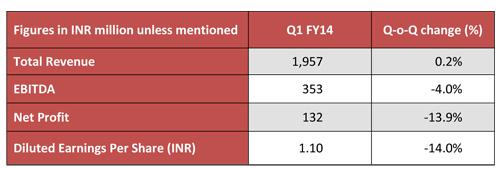 Commenting on TAKE Solutions’ performance, Srinivasan H.R., Vice-Chairman & Managing Director, TAKE Solutions said, “The performance during the quarter ended June 30, 2013 was as per our guidance for FY14. The demand continued to be soft during the quarter and is expected to remain subdued in the short term. We continue to work towards realigning our businesses and operations to make the company more profitable and creating value for our shareholders in the long term. Our focus is to be a 360 degree solution provider to the Life Sciences industry and to be a niche player in the Supply Chain Management domain”