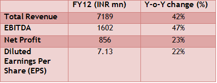 Chennai, May 26, 2012: TAKE Solutions Ltd. [BSE: 532890 | NSE: TAKE], a leader in the Supply Chain Management (SCM) and Life Sciences (LS) domains, announced the financial results for the quarter and the year ended March 31st 2012, today. The company has posted healthy revenues of INR 7,189 Mn for FY ending March 31st 2012 which is 42% increase against year ended March 31st, 2011. Net profit for FY12 was INR 856 Mn; an increase of 23% Y-o-Y.